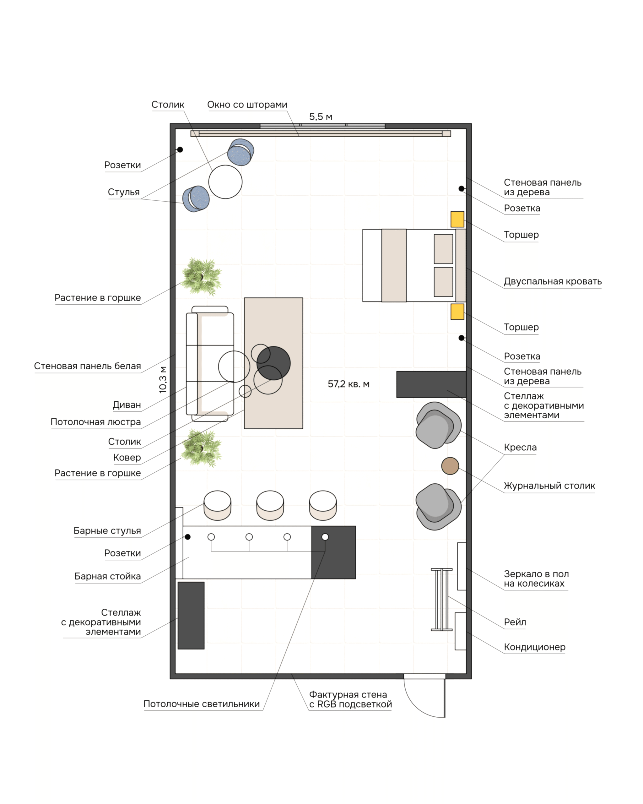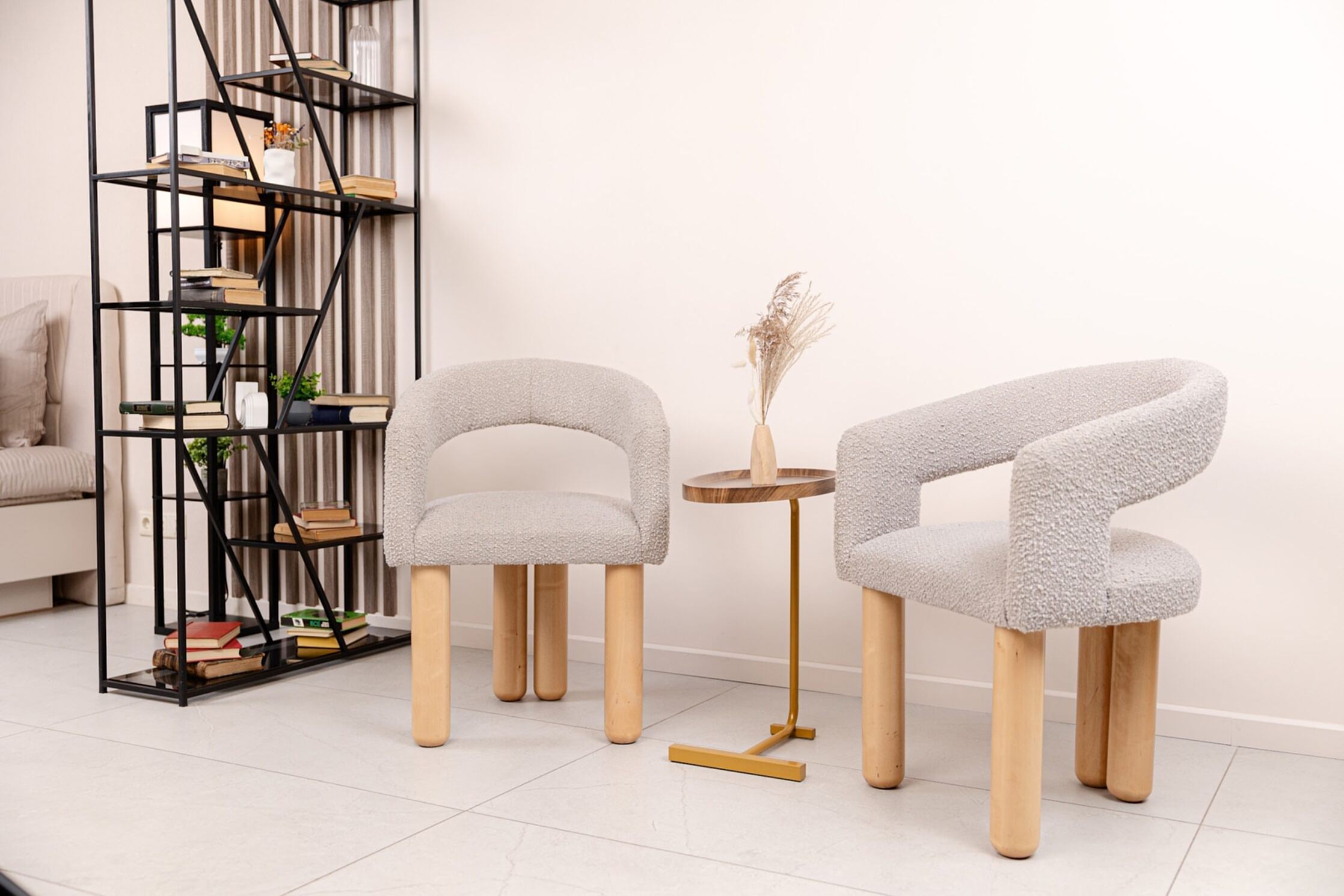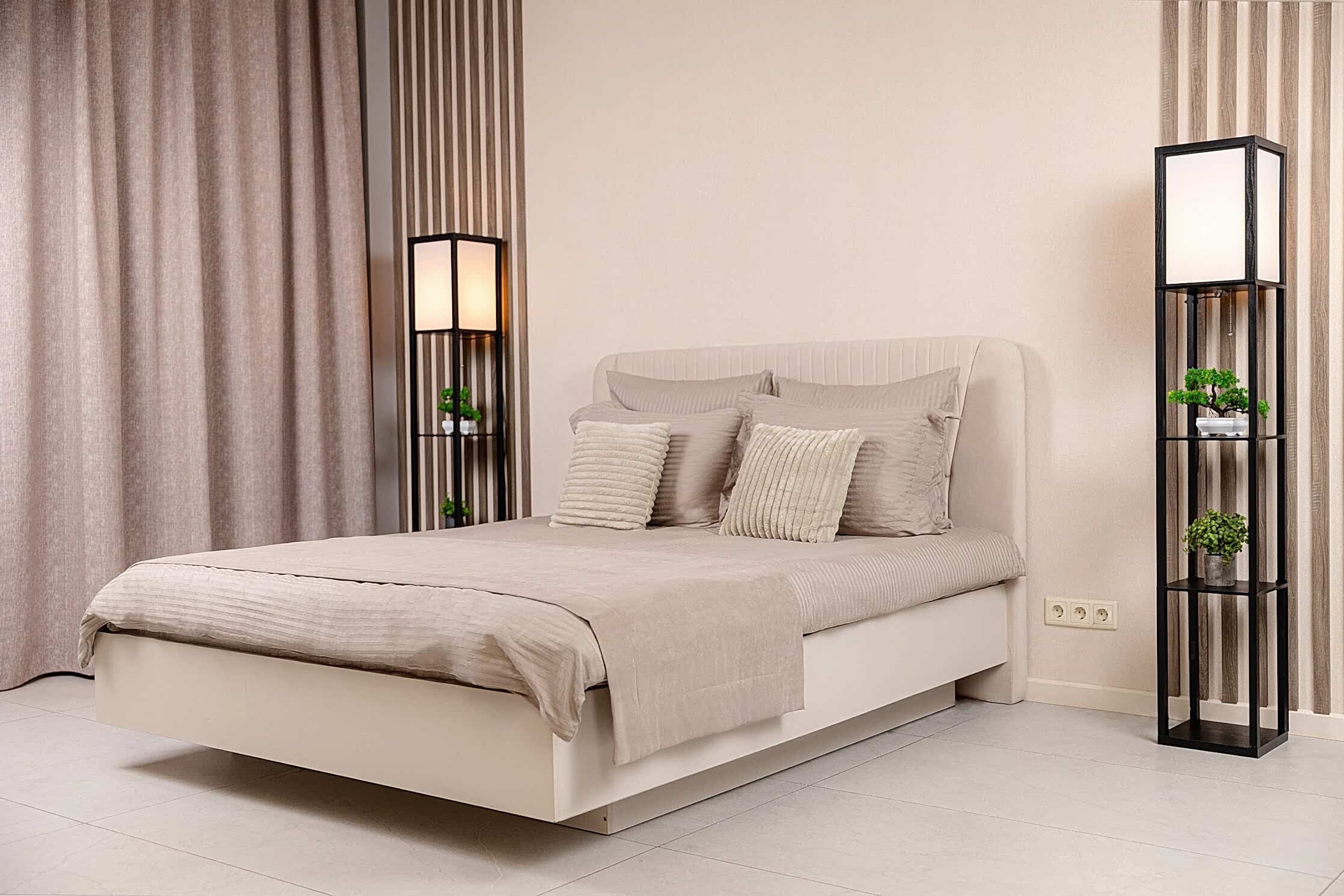 Зал с преобладающим бежевым цветом наполнен атмосферой уюта. Элегантный декор будет хорошей локацией для любого вида съемок: портретной, fashion, предметной, свадебной, съемки лукбука и многих других творческих проектов. Он не будет перебивать внимание от главного, а наоборот, выделит вас на своем фоне, делая фото нежным и насыщенным. В зале предусмотрено 3 основных зоны для съемки в фотостудии. Гостиная часть, спальня с кроватью и барная зона.