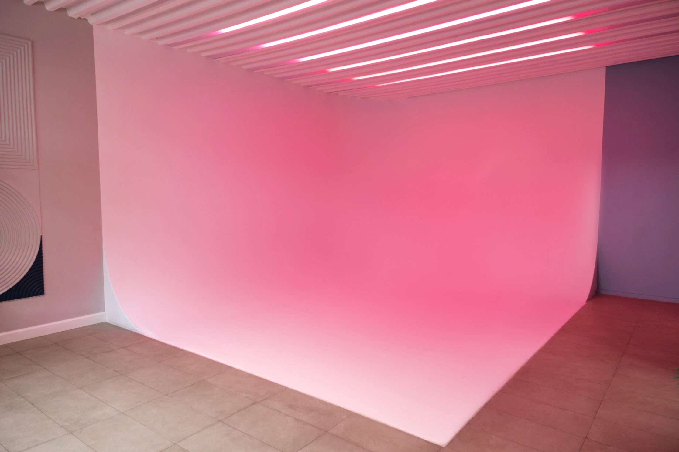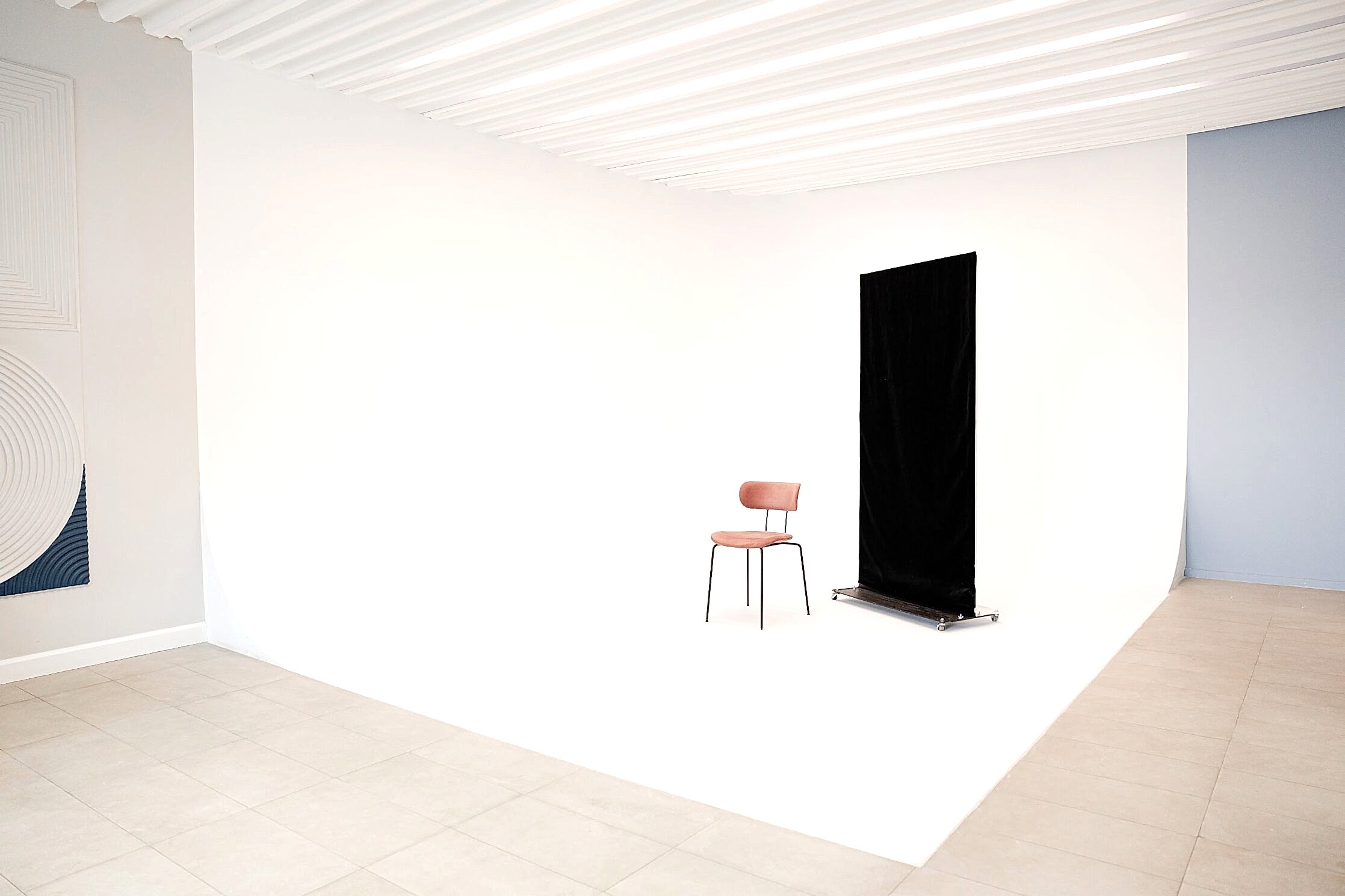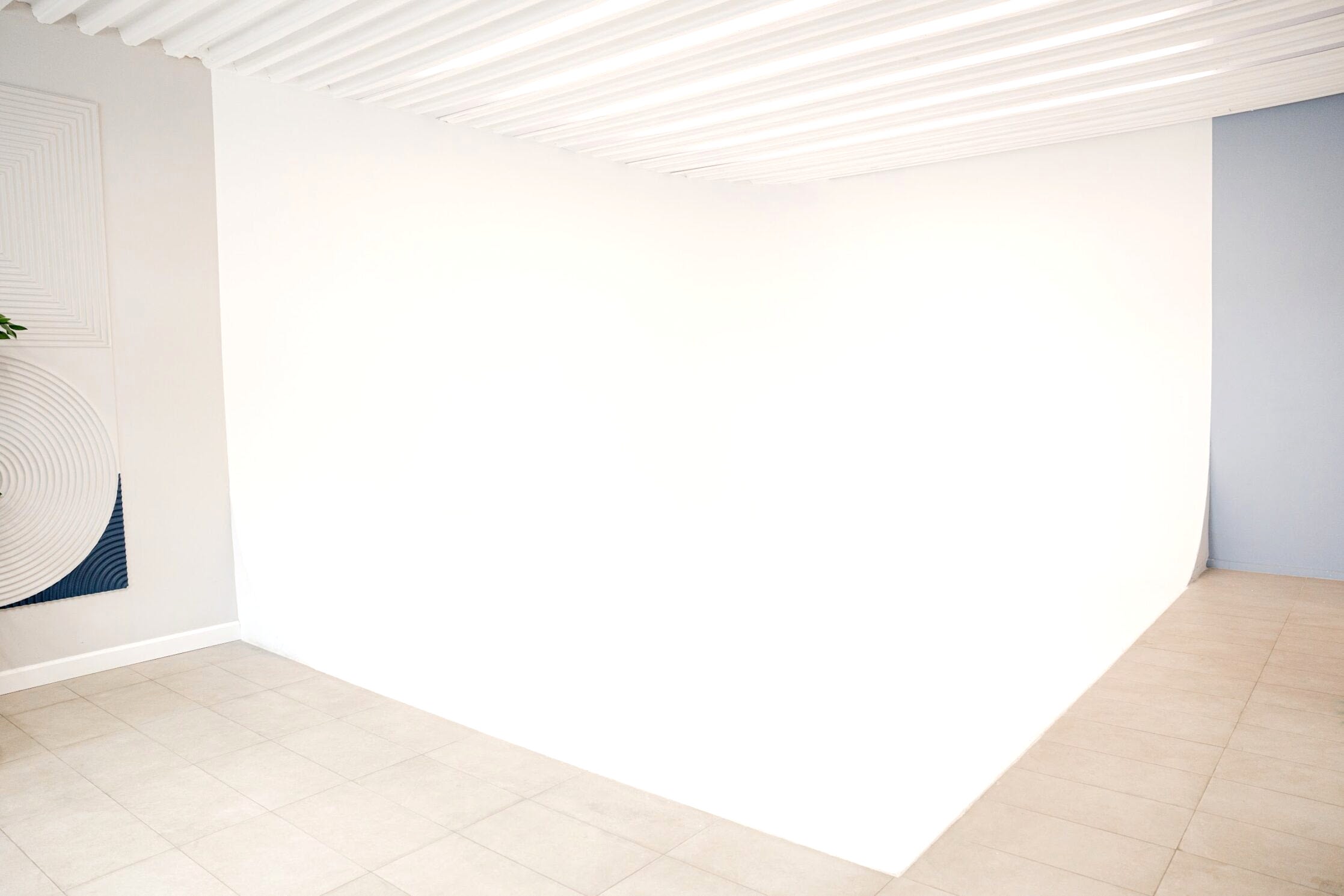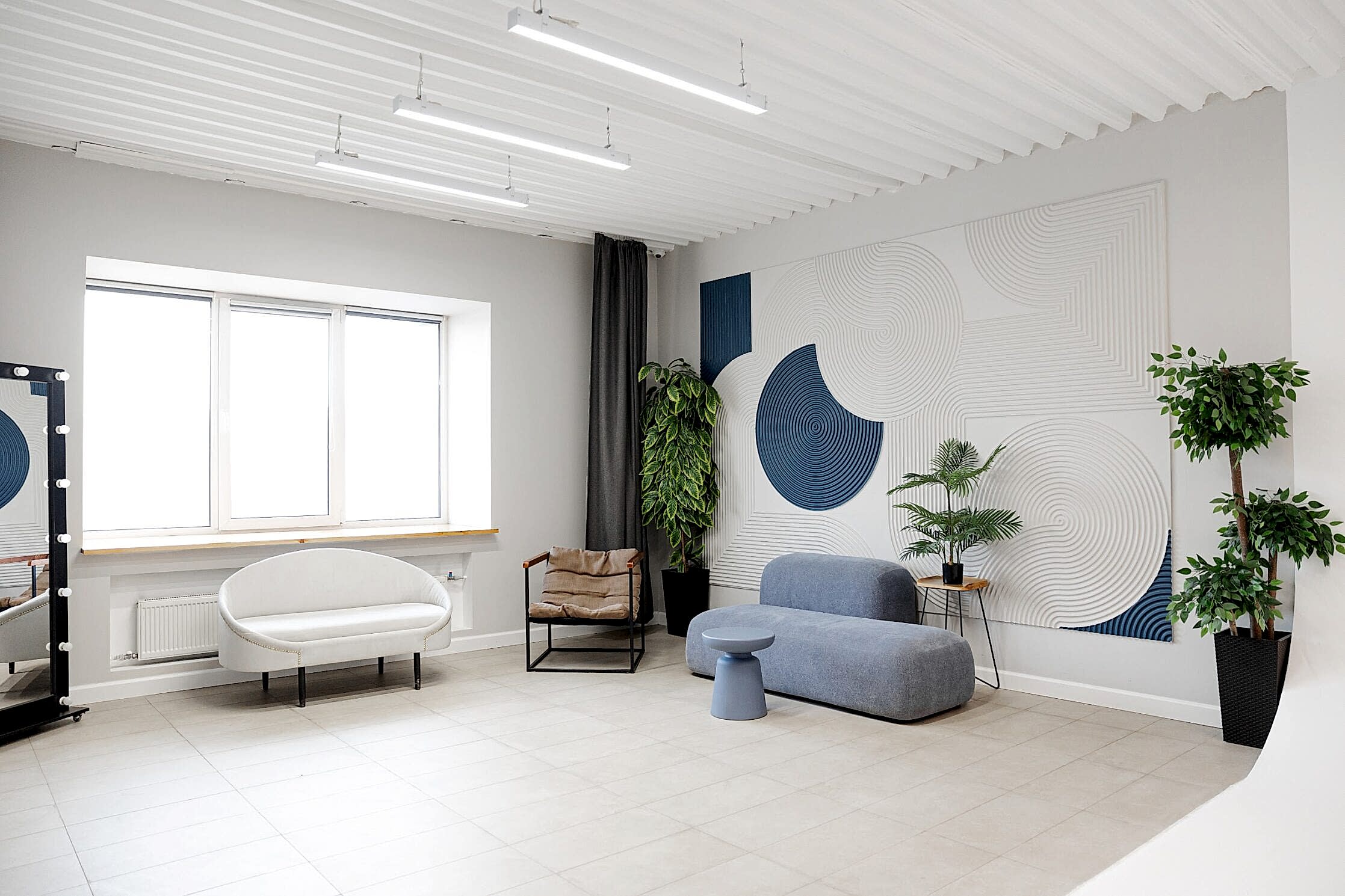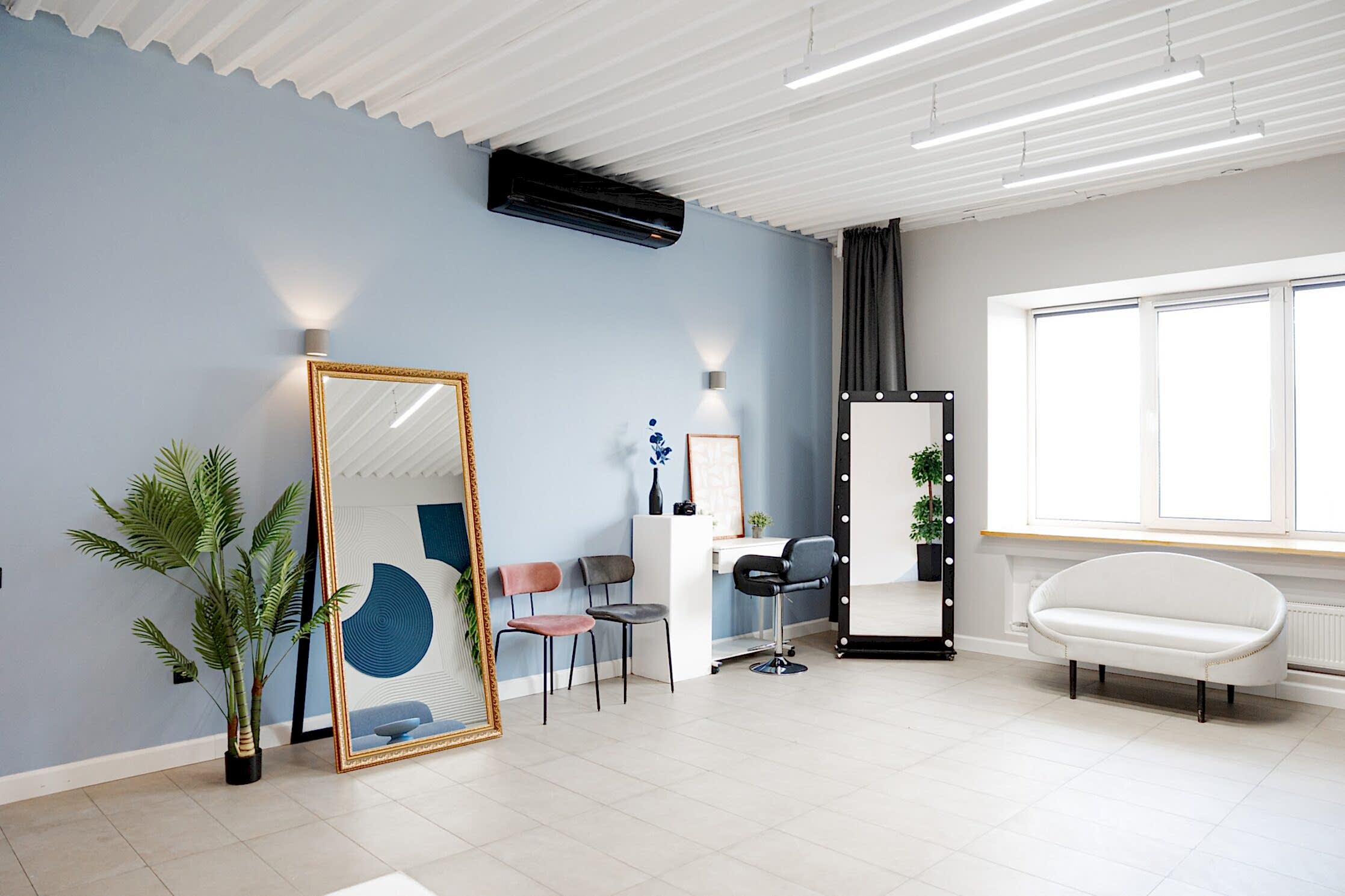 Большой светлый зал с угловой циклорамой высотой 3.20 и размером 4х5 метров и просторной рабочей зоной. Вы можете арендовать студию для съемки на два PinUp и больше в Алматы. В зале предусмотрен гримерный пост, багетное зеркало, диван и другая мебель. Фактурная стена служит в качестве дополнительного декоративного элемента интерьера. В зале высокие потолки, а общаяплощадь Достык, 123 57 квадратных метров.