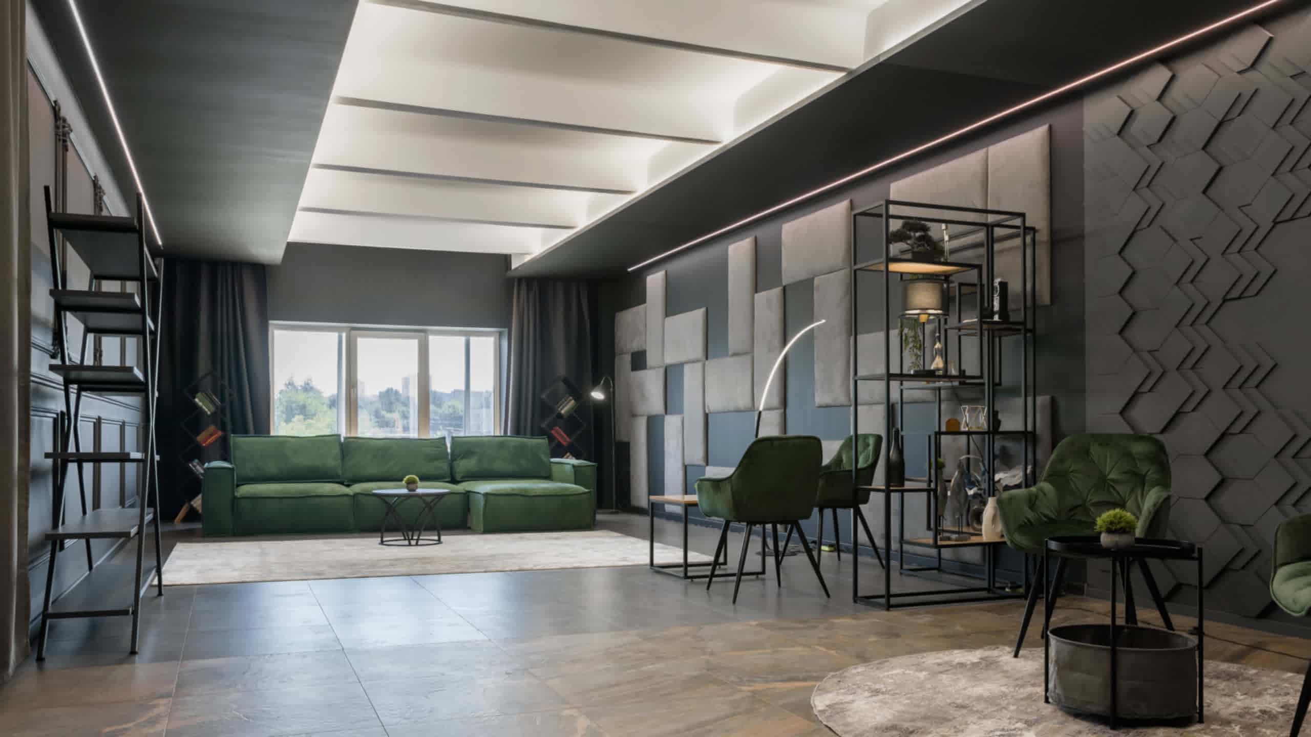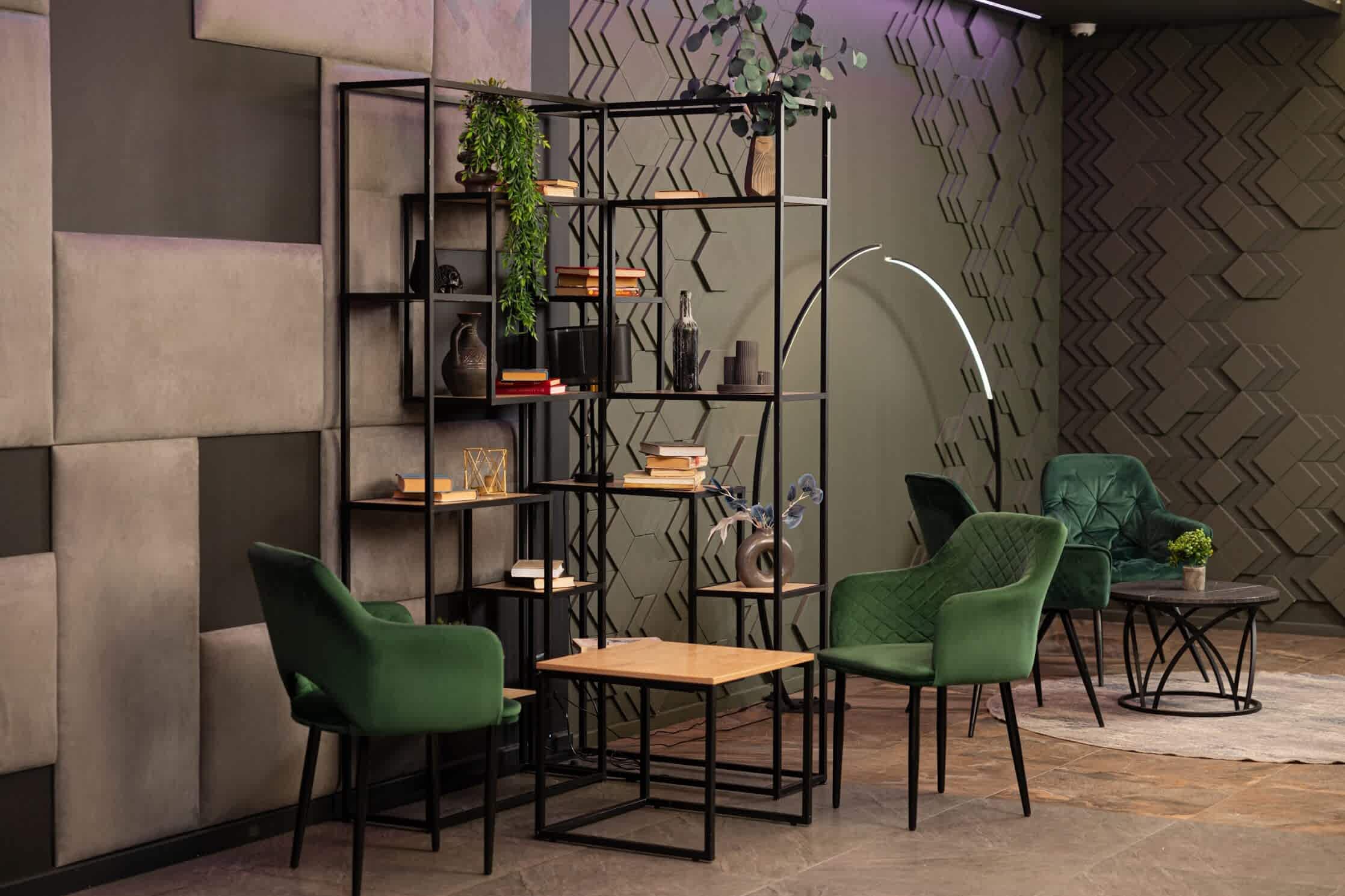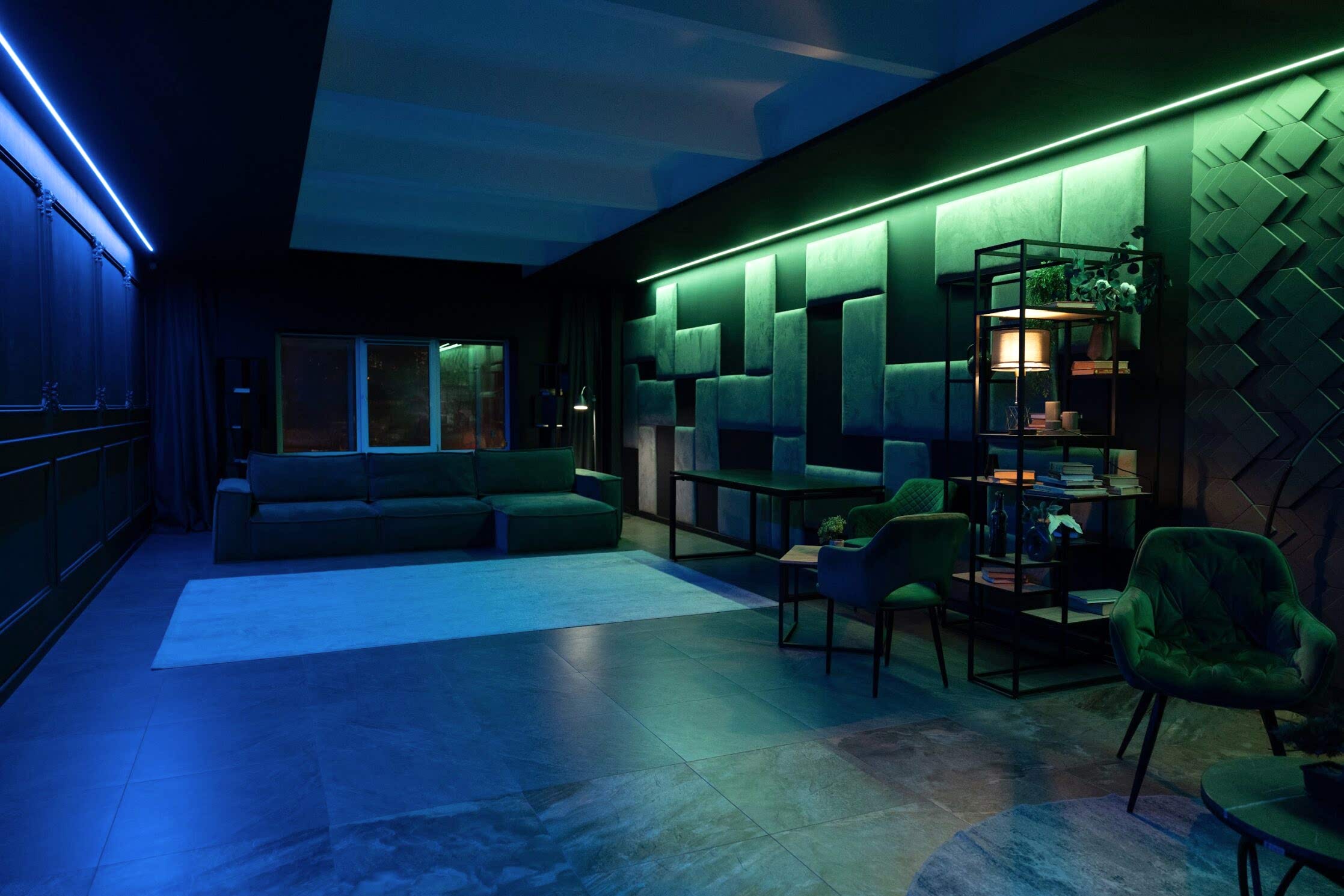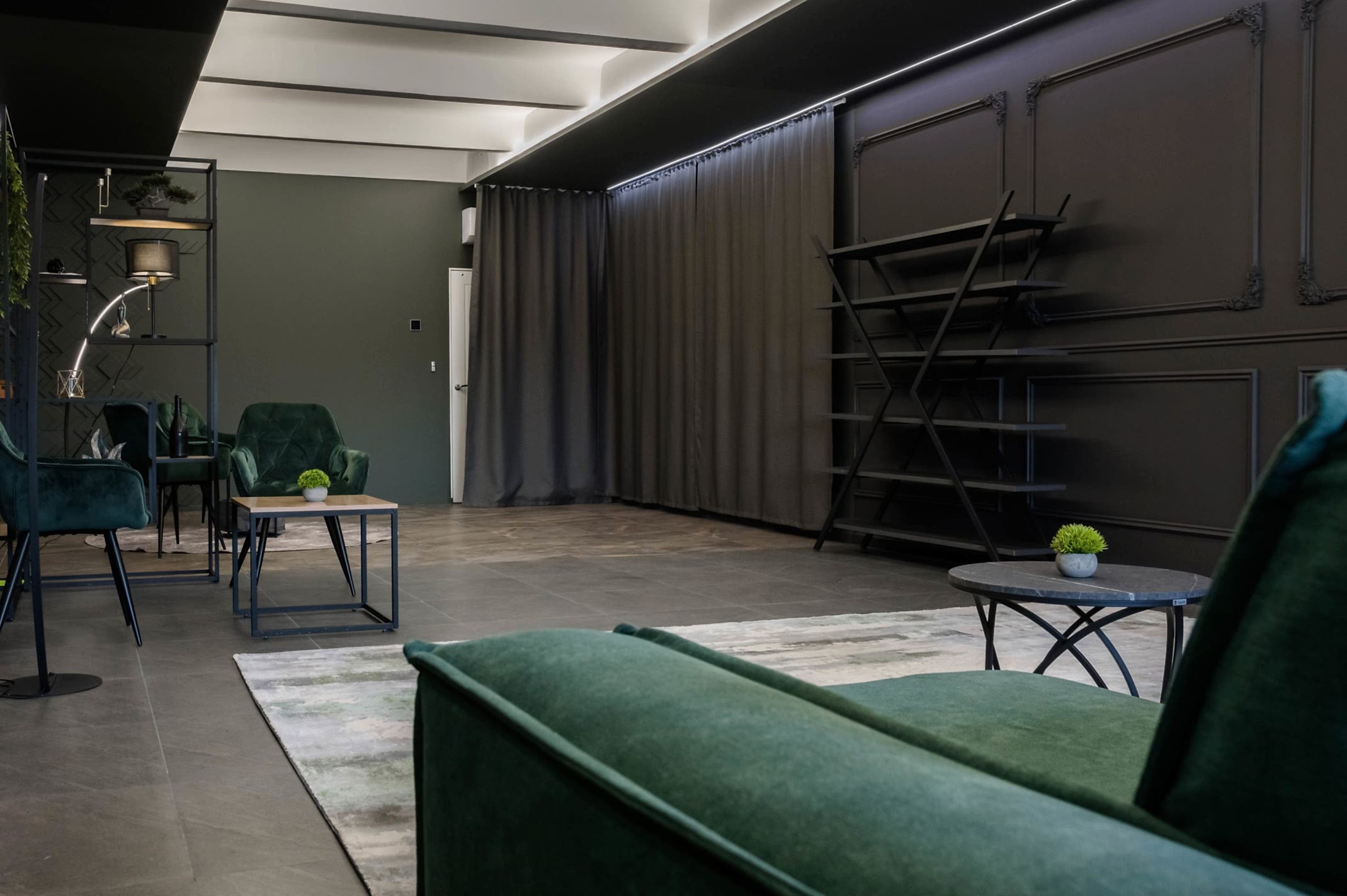 Просторный, темный зал разделенный на две зоны. Подкаст подходит для любых видов PinUp благодаря разноплановому интерьеру и приятной атмосфере. Основная часть располагает в себе длинный, зеленый диван несколько стеллажей, торшеры и стулья, а также два небольших кофейных столика. Отделка стен по одной стороне выполнена в классическом стиле, создавая уникальное и экстравагантное пространство, для воплощения фото и видео проектов. На второй стороне стены с мягкими и жесткими стеновыми панелями.