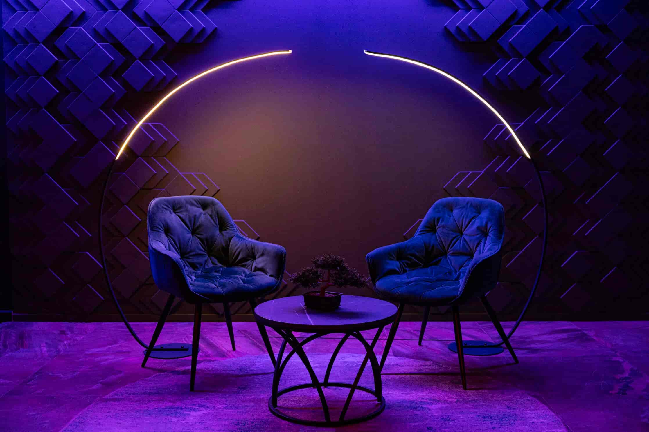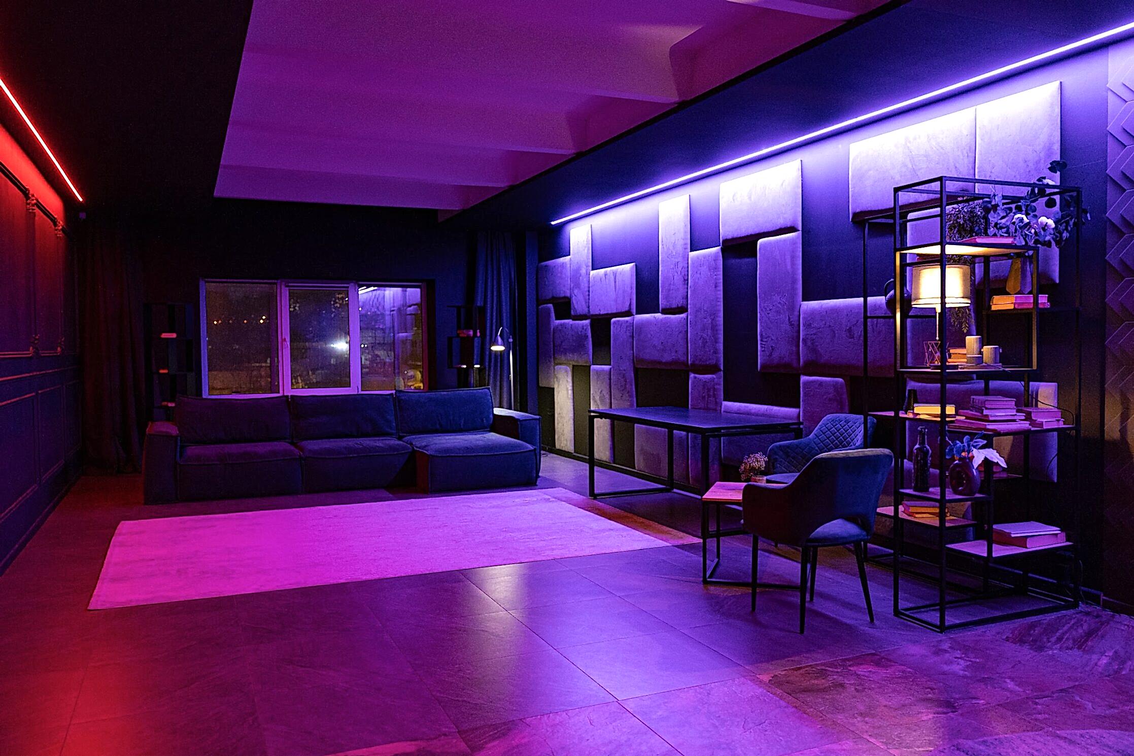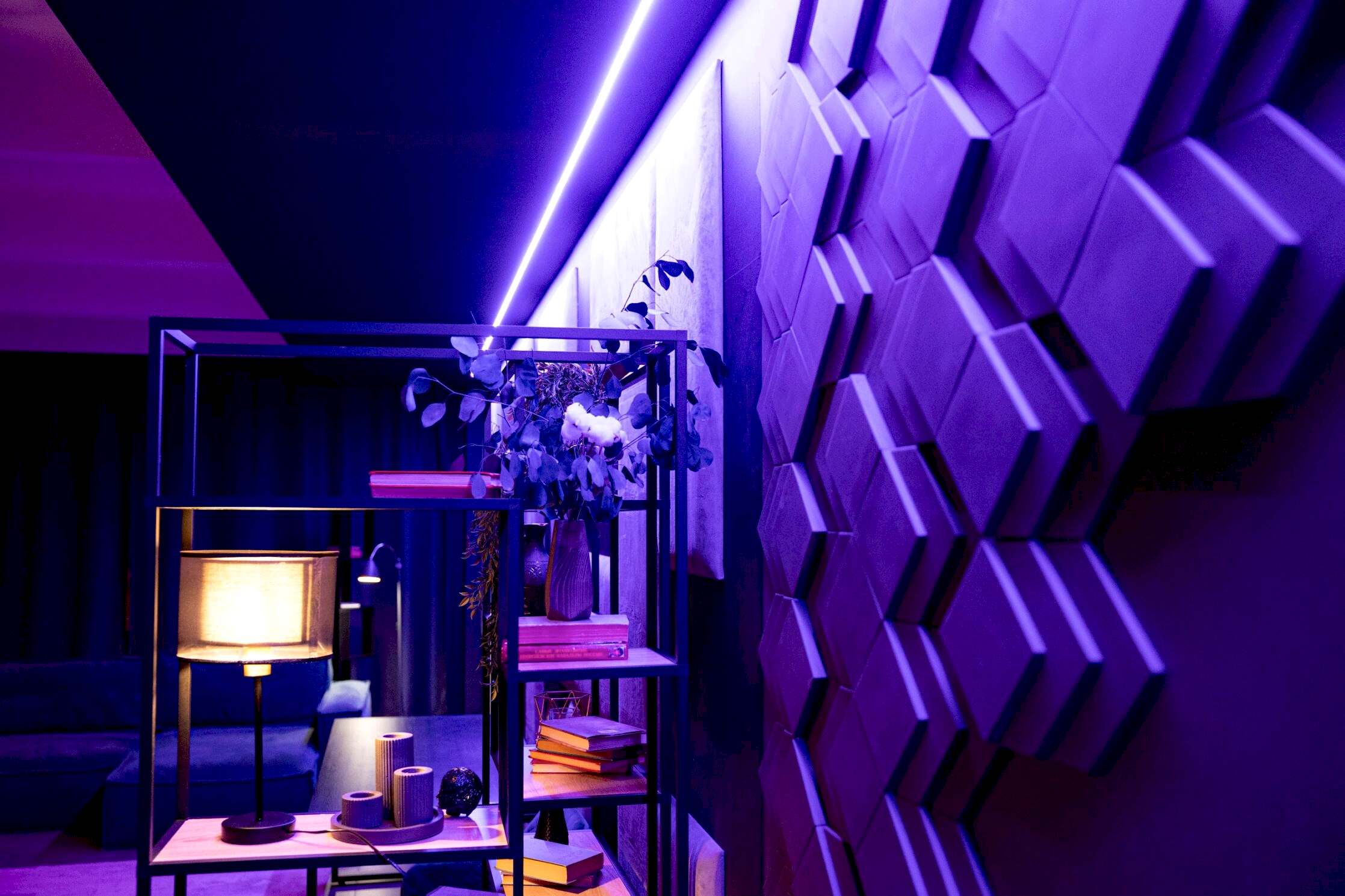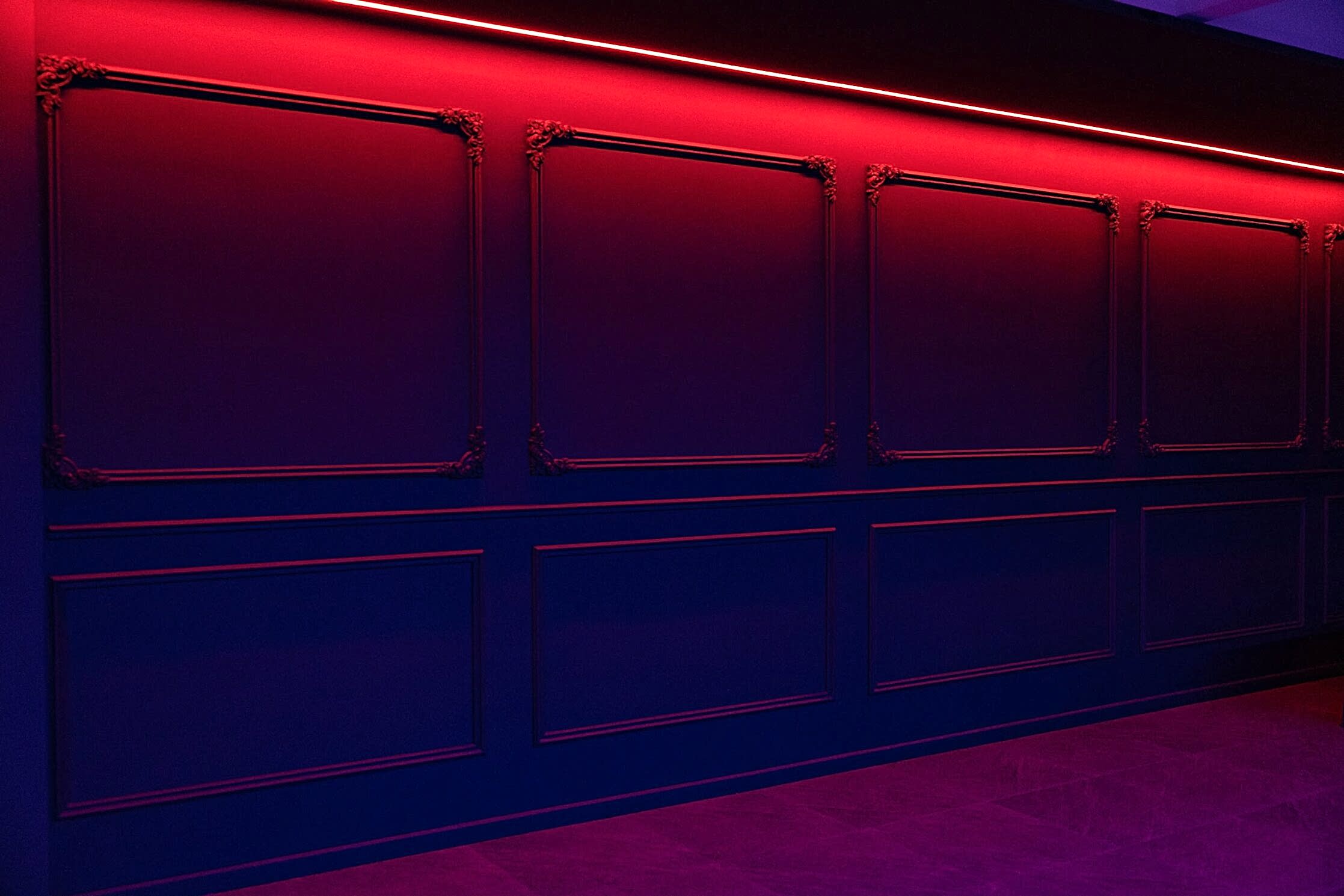 Просторный, темный зал разделенный на две зоны. Подкаст подходит для любых видов PinUp благодаря разноплановому интерьеру и приятной атмосфере. Основная часть располагает в себе длинный, зеленый диван несколько стеллажей, торшеры и стулья, а также два небольших кофейных столика. Отделка стен по одной стороне выполнена в классическом стиле, создавая уникальное и экстравагантное пространство, для воплощения фото и видео проектов. На второй стороне стены с мягкими и жесткими стеновыми панелями.